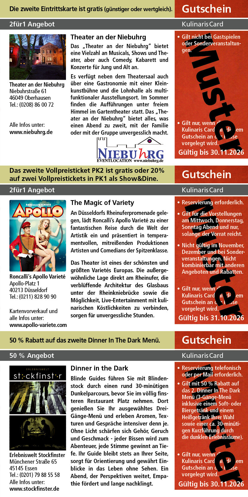 - Die Kartenkontingente bei Veranstaltungen sind teilweise begrenzt. Bitte reservieren Sie rechtzeitig, da eine Einlösung bei ausverkauften Veranstaltungen ausgeschlossen ist.