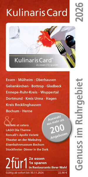 Die Kulinaris Card ist ein Gutscheinbuch mit einer handlichen Scheckkarte und ermöglicht Ihnen im Ruhrgebiet und im Münsterlan eine Vielzahl kulinarischer 2für1 Erlebnisse sowie 2für1 Gutscheine aus den Bereichen Varieté, Theater, Wellness....